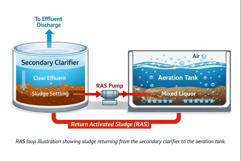RAS (Return Activated Sludge) adalah proses mengembalikan lumpur aktif yang mengendap dari penjernih sekunder kembali ke reaktor biologis.